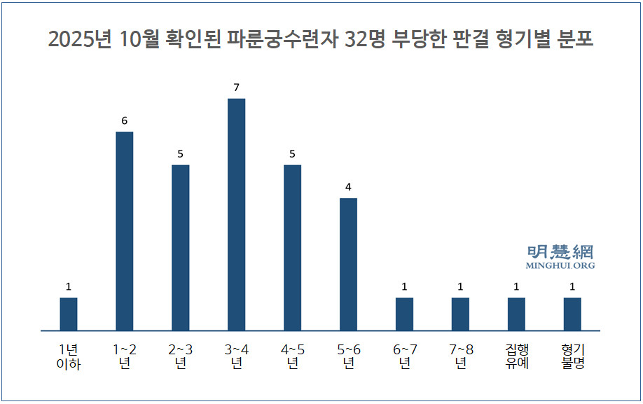 2025년 10월에 확인된 파룬궁수련자 32명 중공의 부당한 판결 형기별 분포