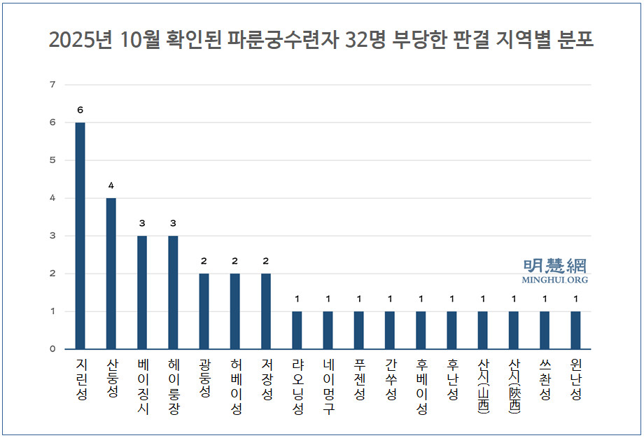 2025년 10월 확인된 파룬궁수련자 32명 중공의 부당한 판결 지역별 분포