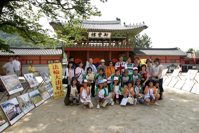 수원화성 행궁을 참관한다는 계획을 미리 파악하여 우리 동수들은 “法輪大法好” 현수막과 사진전시용 액자를 차량에 가득싣고 화성행궁에