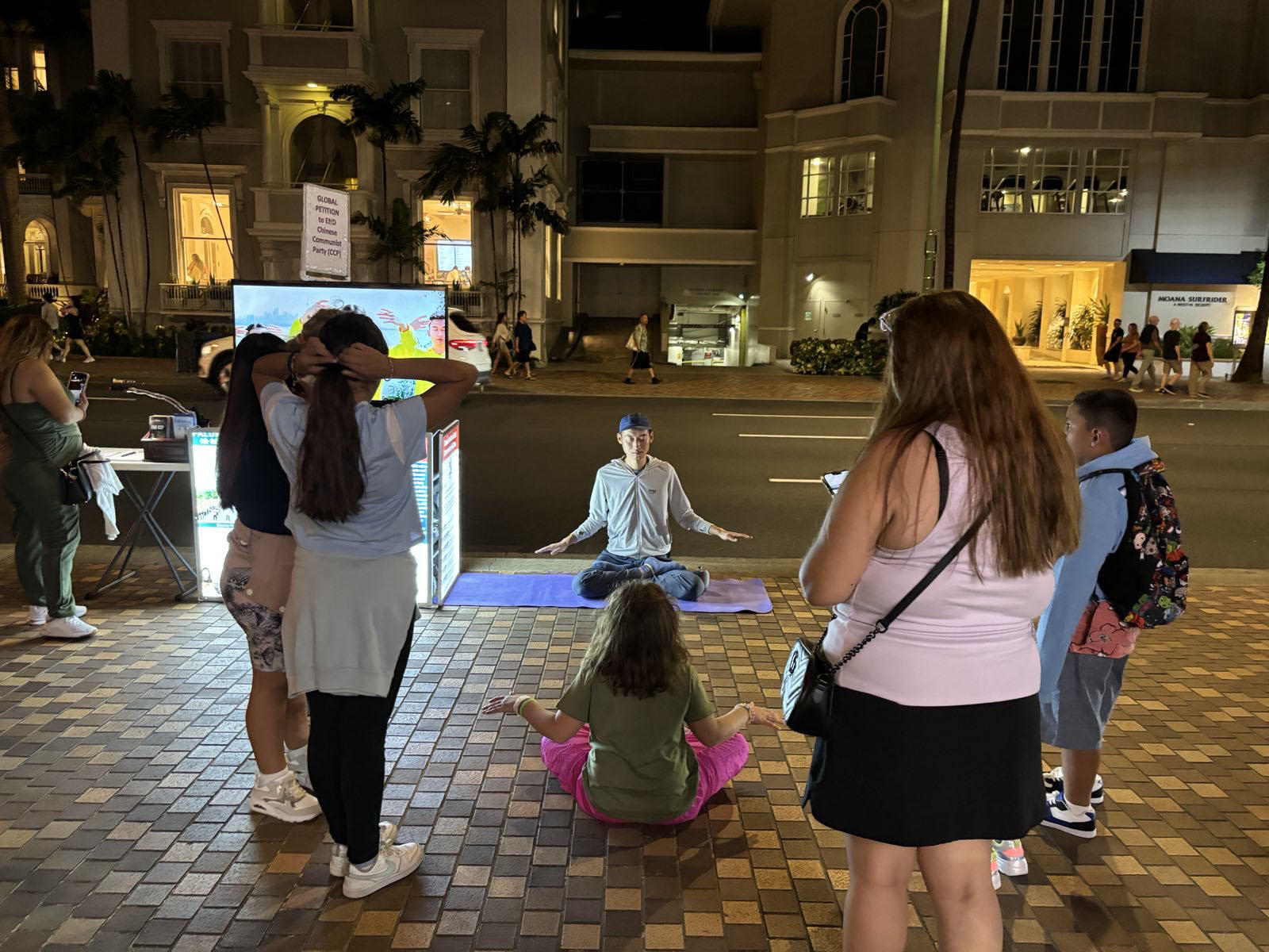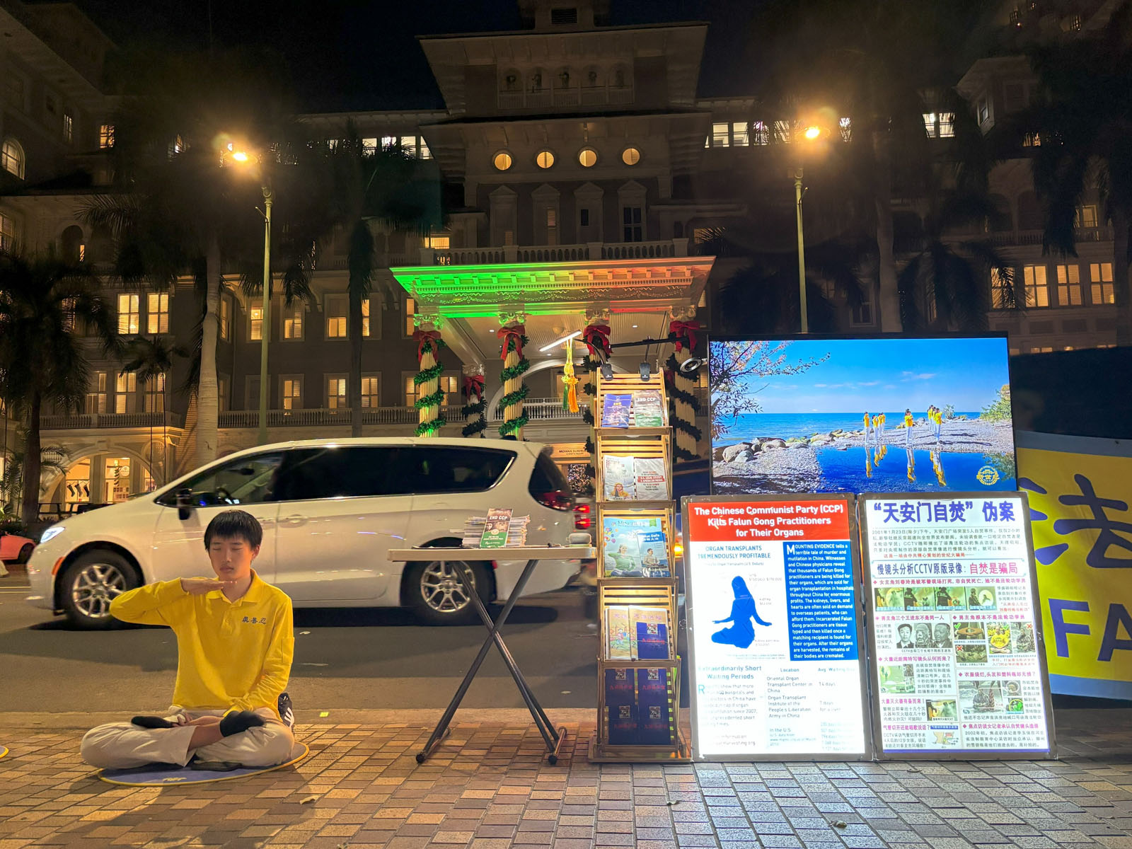 [명혜망] 2025년 12월 27일 저녁, 하와이의 한 진상점(파룬궁 박해 실상을 알리는 곳) 일부 파룬궁수련자가 와이키키(Waikiki) 관광 지구 칼라카우아(Kalakaua) 대로에 모여 파룬궁 창시자 리훙쯔(李洪志) 사부님께 새해 인사를 올렸다.