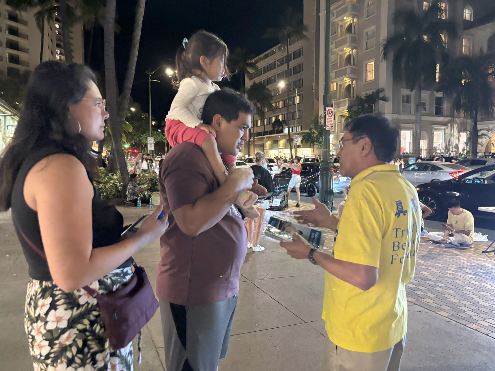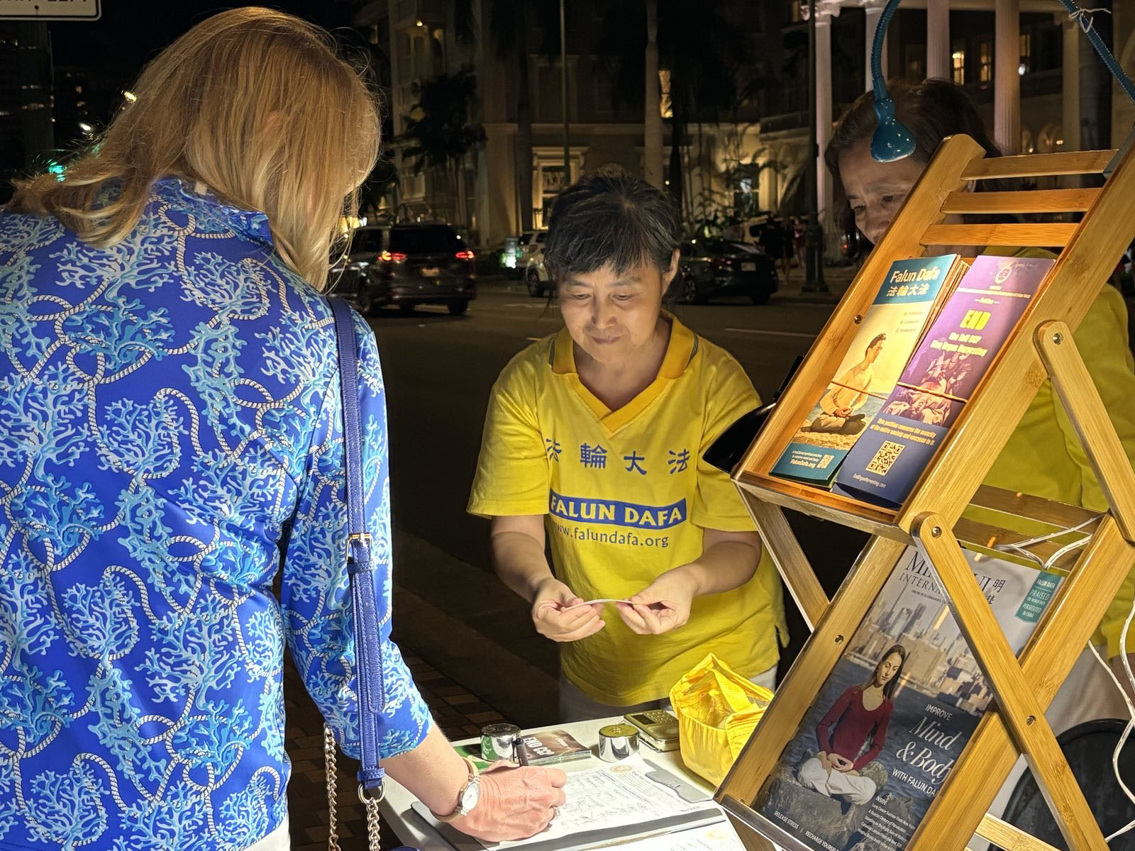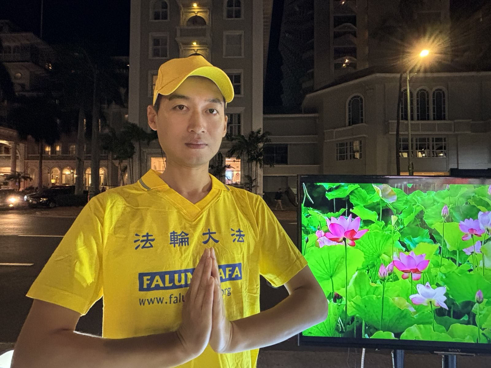 2003년에 득법한 수련자 칭 씨는 10여 년간 수련하면서 병 없이 가벼운 몸이 됐다. 칭 씨는 자주 와이키키 진상점에 가서 연공하고 파룬궁을 소개하며 진상 자료를 배포한다. 한번은 한 남성이 대법제자가 고문당하고 생체 장기적출 당하는 그림을 보았을 때, 무릎을 꿇고 전시판 앞에서 계속 옷깃으로 눈물을 닦았는데, 칭 씨도 그의 선량함에 깊이 감동했다.