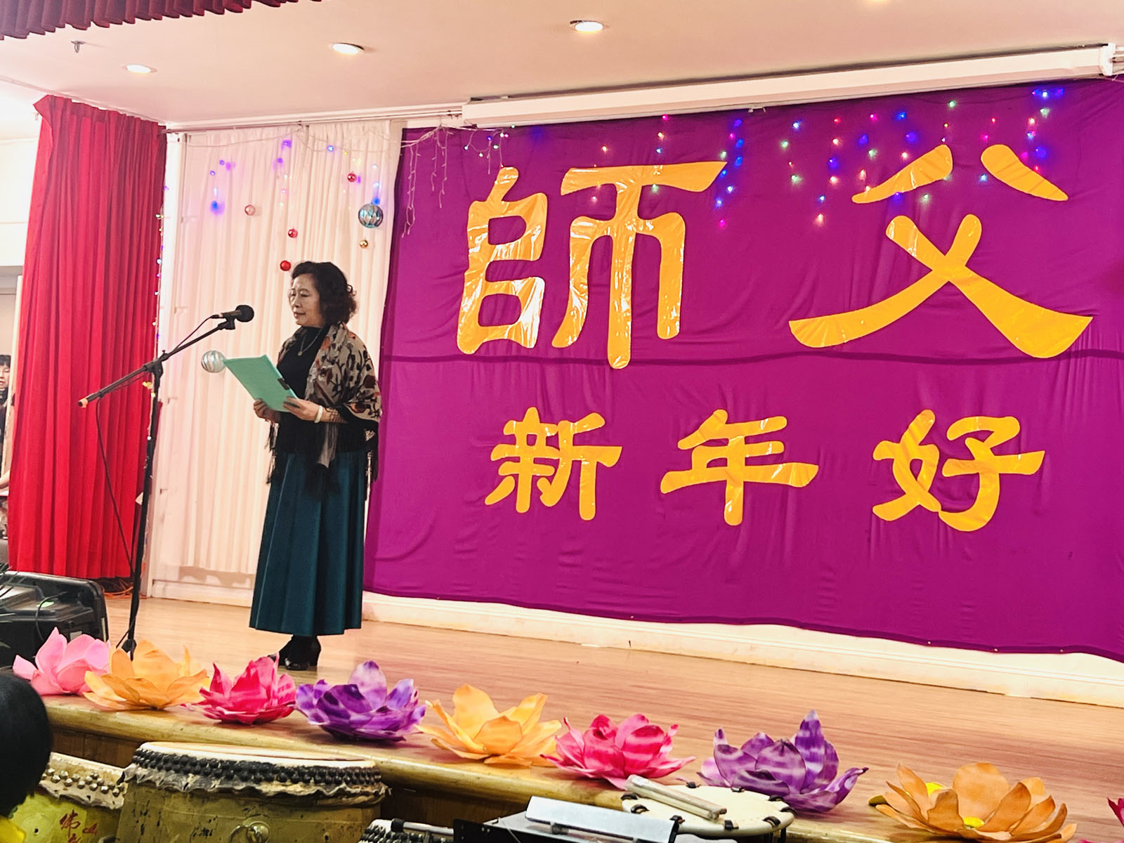 실외는 눈 덮인 추운 날씨였으나 행사장 안은 온기가 가득했다. 중앙 무대는 생화로 둘러싸이고 화려한 등불로 장식됐으며, 무대 중앙의 보라색 배경 막 위에는 황금빛 대자로 ‘사부님 즐거운 신년 되세요’라는 문구가 눈부시게 빛나고 있었다. 회관은 빈자리 없이 가득 찼으며 행사에 참가한 각 민족 수련자 중에는 연령대가 80~90세 고령자부터 겨우 몇 살 된 어린이까지 다양했다. 그들 중에는 30여 년간 수련해 온 노제자도 있었고, 이제 막 입문한 신수련생도 있었다. 모두 가슴 앞에 두 손을 모으고 합장한 채 공경히 일제히 외쳤다. “사부님 즐거운 신년 되십시오! 파룬따파하오! 쩐싼런하오!”