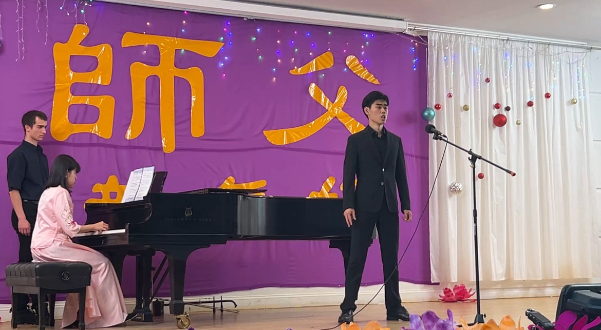 제10회 NTD TV 글로벌 화인 성악대회 은상 수상자인 바리톤 케빈 장(Kevin Zhang)은 이날 리훙쯔(李洪志) 사부님께서 창작하신 ‘감추기 어렵네’를 불렀다. 케빈 장은 현재 북방대학 미들타운 캠퍼스의 대학생으로, 어릴 때부터 어머니를 따라 수련해 왔다. “제가 이 대법을 얻을 수 있었던 것은 제 인생 최고의 행운입니다! 파룬따파는 어떻게 좋은 사람이 되는지와 타인을 배려하는 법을 저에게 가르쳐 주었으며, 어려움에 부닥쳤을 때 어떻게 대처해야 하는지, 문제가 생기면 ‘안으로 찾기’를 통해 자신의 부족함을 찾고 어떻게 올바르게 대해야 하는지 가르쳐 주었습니다. 대법이 가르쳐 준 마음가짐은 제가 성악의 길에서 끊임없이 진보할 수 있었던 핵심입니다.”