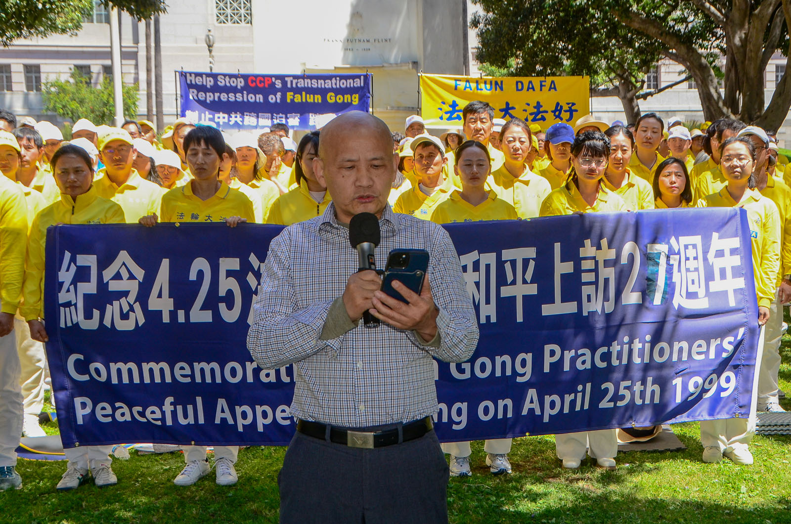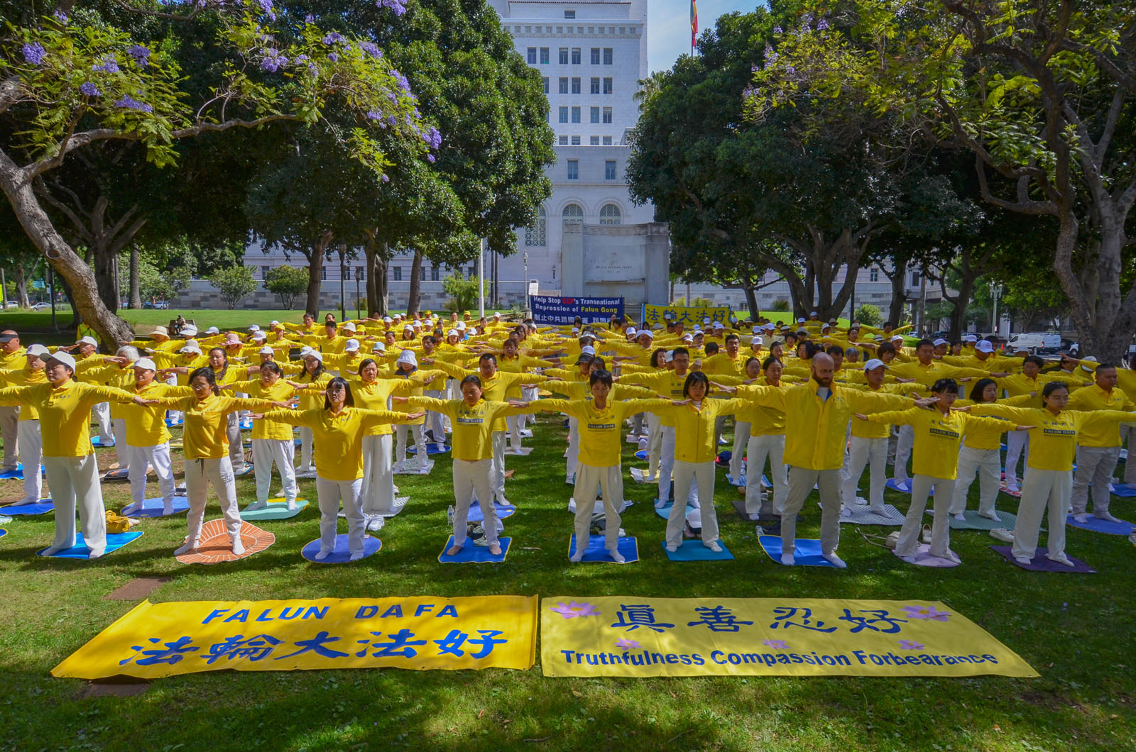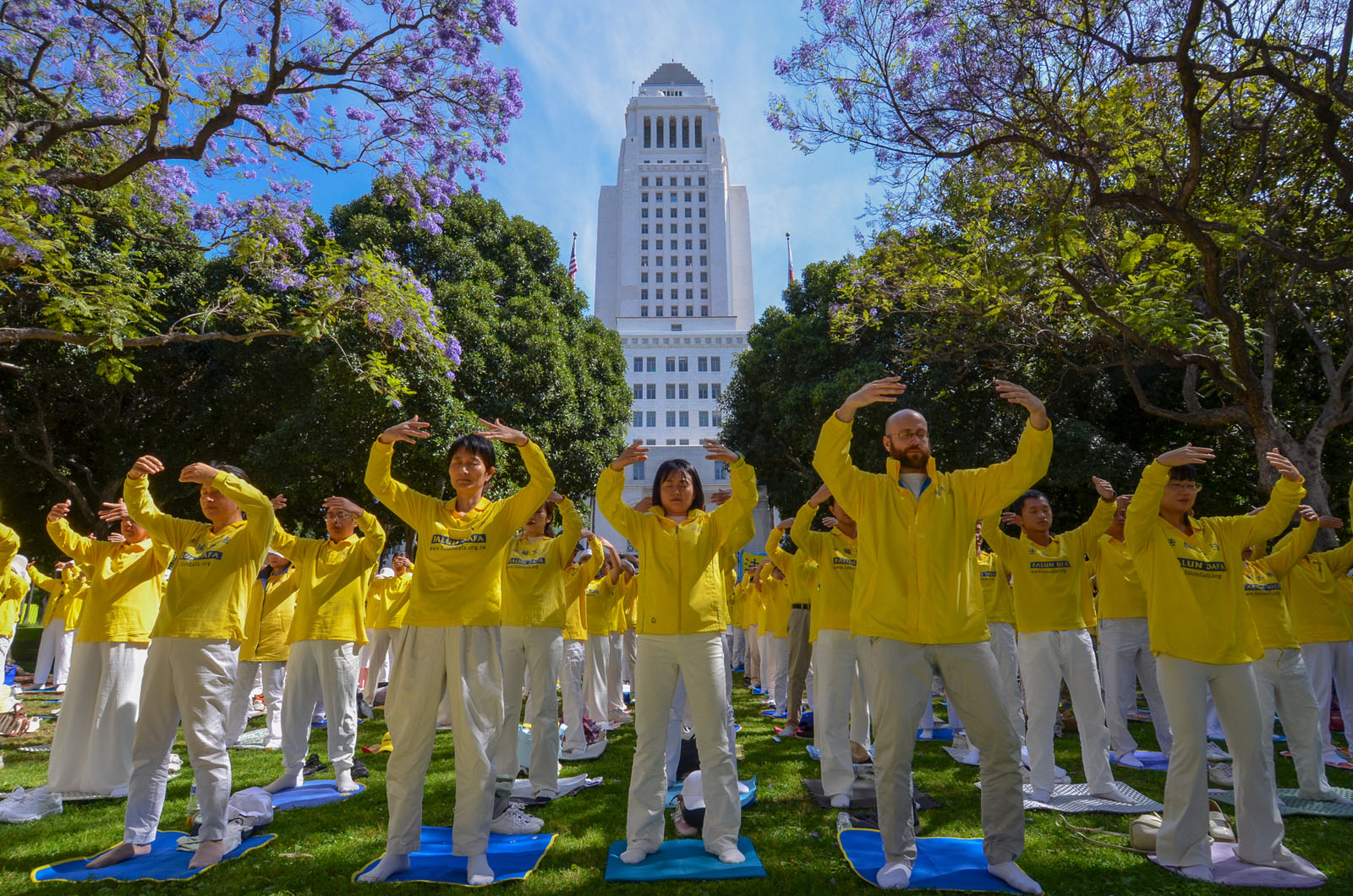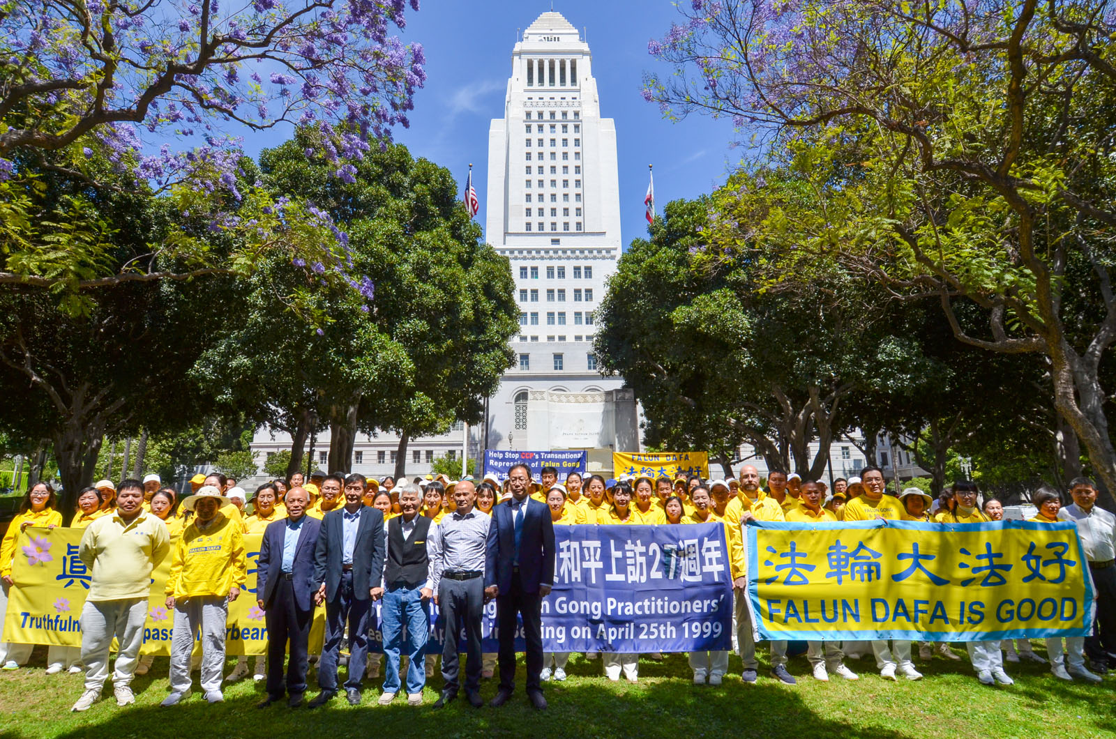 [명혜망](LA 통신원) 2026년 4월 23일, 미국 LA 시청 앞 푸른 잔디밭에서 노란색 상의를 입은 파룬궁수련자들이 파란 하늘과 흰 구름 아래에서 정좌하고 집회를 열어 1999년 1만 명의 파룬궁수련자들의 ‘4·25’ 평화청원 27주년을 기념했다. 그들은 각국의 정의로운 인사들이 함께 참여해 중국공산당(중공)이 파룬궁에 대해 27년간 지속해 온 박해를 저지할 것을 호소했다.