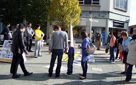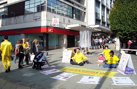 [밍후이왕] 2009년 10월10일, 영국북부 수련생들이 셰필드 중심가에서 행인들에게 파룬궁과, 중국에서 중공이 파룬궁수련생에게 자행하고 있는 박해를 알렸다.