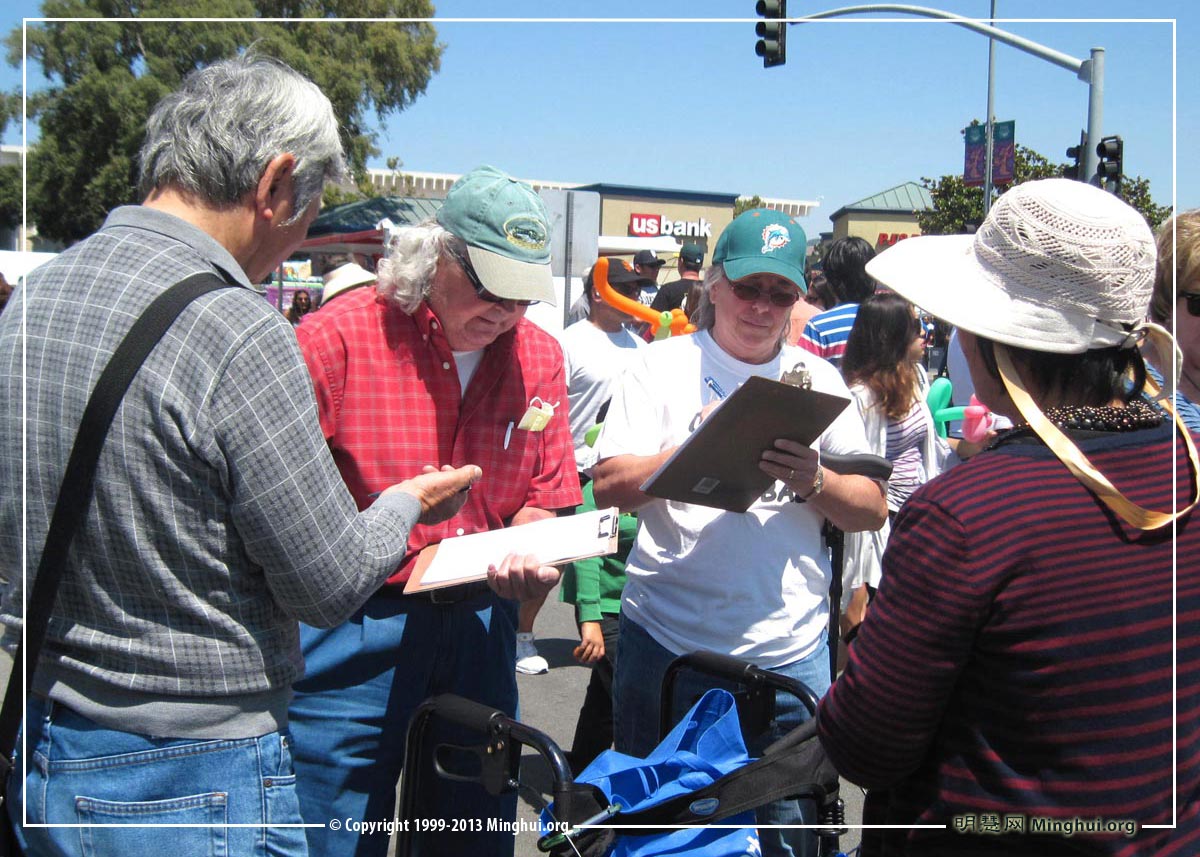 [밍후이왕] (밍후이 기자 왕잉 캘리포니아주 프리몬트 보도) 2013년 8월 3일과 4일, 미국 샌프란시스코 베이지역의 파룬궁 수련생들은 프리몬트 시 중심에서 열린 예술축제에서 서명활동을 개최하여 중공이 파룬궁 수련생들의 장기를 생체 적출하는 만행을 저지할 것을 요구했다. 이틀간 시민들이 앞다투어 서명하여 약 천여 명이 서명했다.