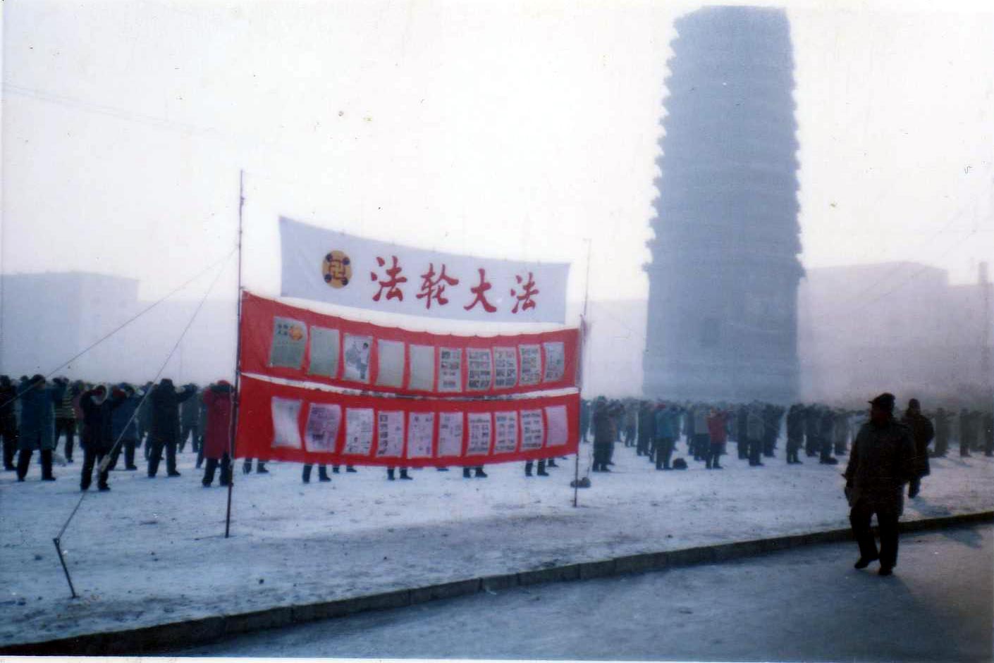 1999년 양력 설, 눙안현과 주변 향진에서 온 파룬궁 수련생 2천여 명이 랴오(遼) 탑 앞에서 단체 연공하여 대법을 홍보하는 장면이다. 70여세 된 노인에서 5세 된 아동까지 그날 새벽 4시부터 수백 명이 자동적으로 웃고 떠드는 소리 없이 가지런하게 줄을 섰다. 많은 행인들이 파룬따파의 전시 그림을 보고 있다. 날이 밝아오자 큰 빛 고리가 전체 연공장을 비추어, 사람마다 대법의 불광에 비춰졌다.